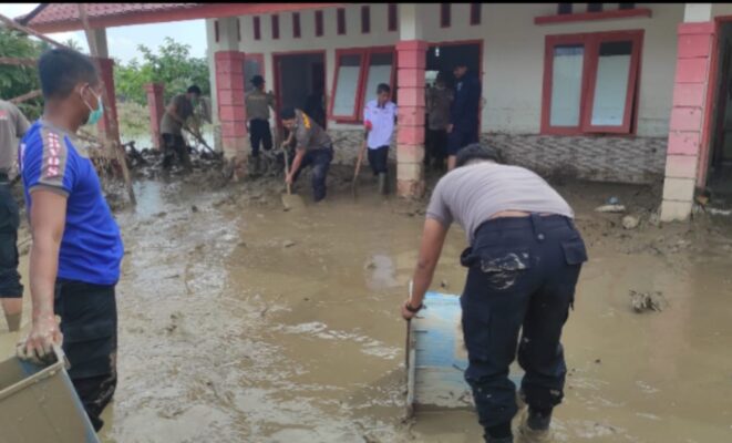 Kadinkes Bersama Polres Bireuen Gelar Gotong Royong Bersihkan Pustu Alue Kuta Pascabanjir