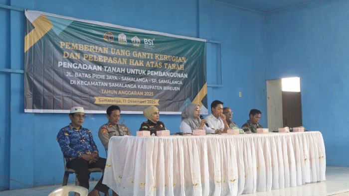 SRN.com-Samalanga – Kantor Pertanahan Kabupaten Bireuen melaksanakan penetapan hak dan pemberian uang ganti kerugian dalam rangka Pengadaan Tanah untuk Pembangunan Jalan Batas Pidie Jaya – Samalanga – SP. Samalanga. Kegiatan ini berlangsung di Kantor Camat Samalanga, Rabu ( 17/12/2025) dan merupakan tahapan penting dalam mendukung percepatan pembangunan infrastruktur jalan di wilayah tersebut.